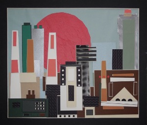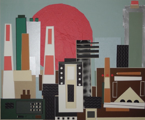 City Scape with Pale Moon - art board and paper - 17”x 14”- $50